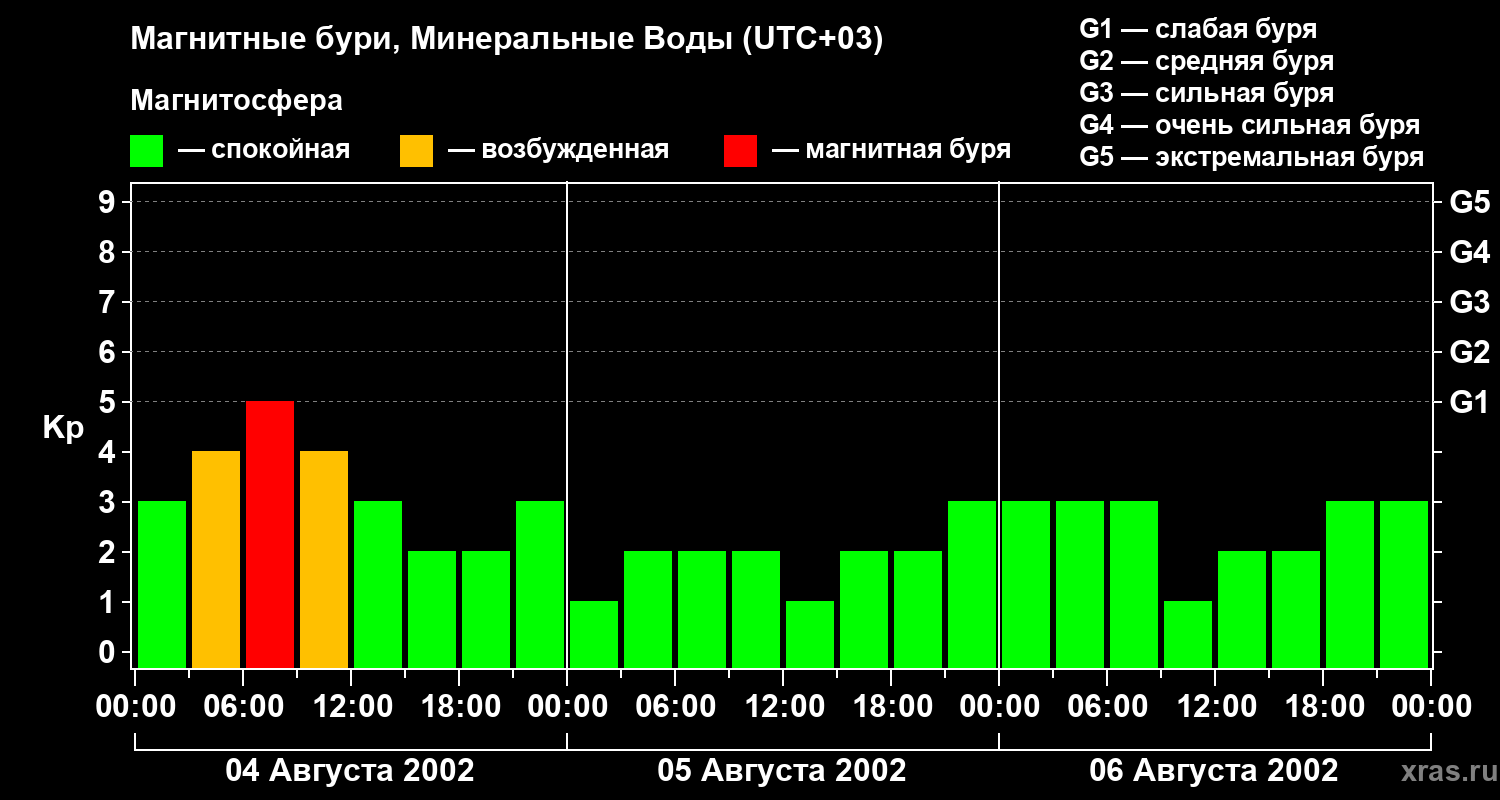 Изменения геомагнитного индекса Kp с 4 по 6 августа 2002 года для средних широт