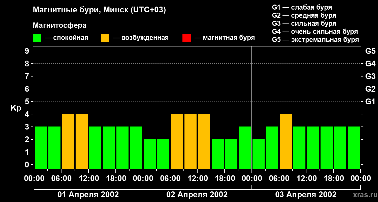 Изменения геомагнитного индекса Kp с 1 по 3 апреля 2002 года для средних широт