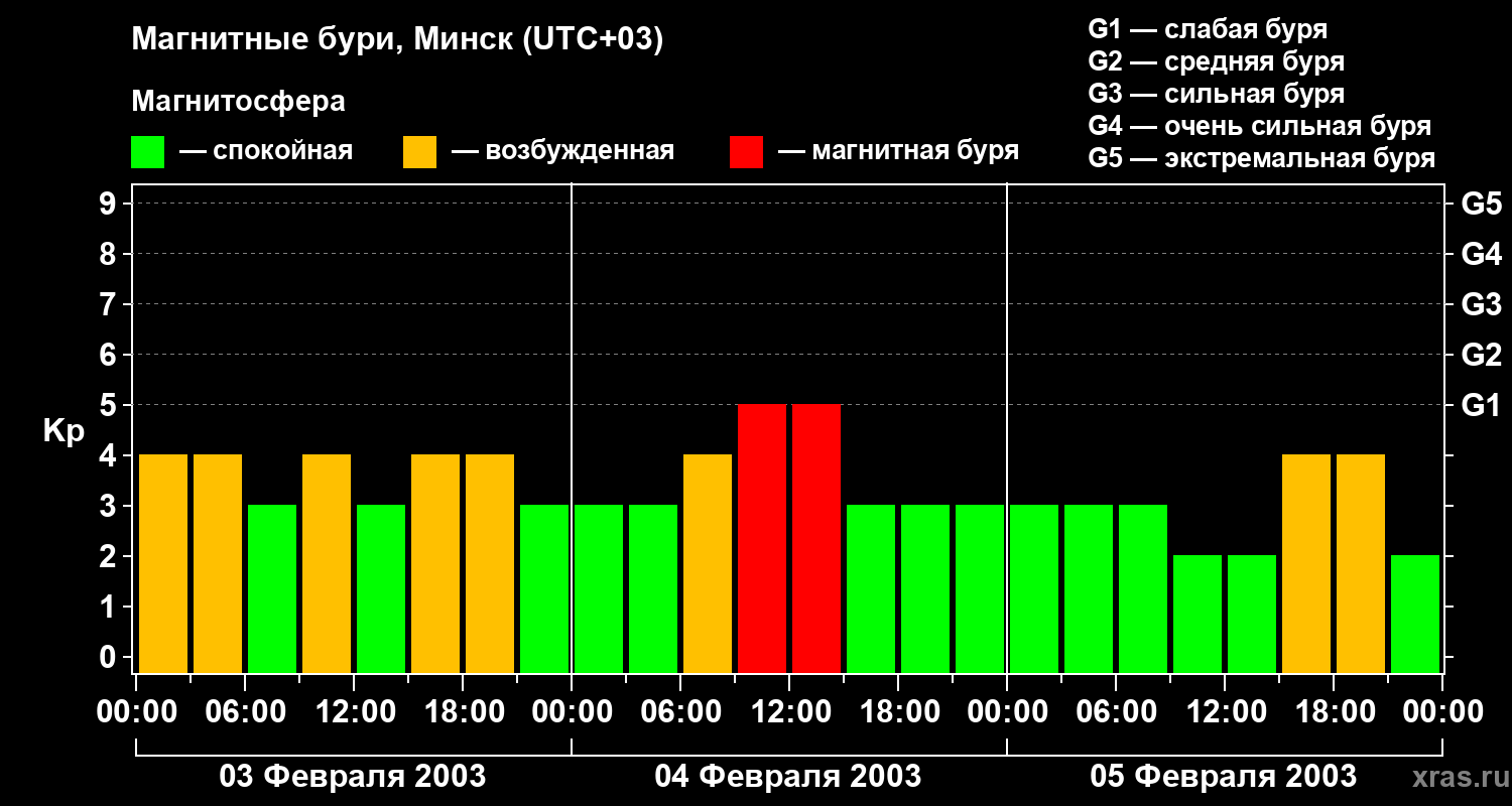 Изменения геомагнитного индекса Kp с 3 по 5 февраля 2003 года для средних широт