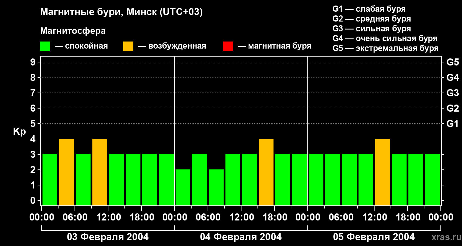 Изменения геомагнитного индекса Kp с 3 по 5 февраля 2004 года для средних широт