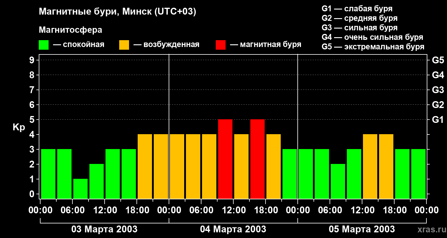 Изменения геомагнитного индекса Kp с 3 по 5 марта 2003 года для средних широт