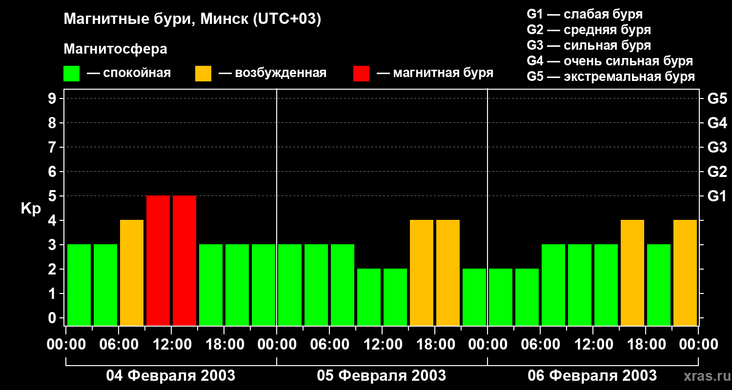 Изменения геомагнитного индекса Kp с 4 по 6 февраля 2003 года для средних широт
