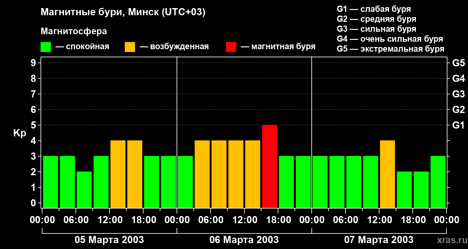 Изменения геомагнитного индекса Kp с 5 по 7 марта 2003 года для средних широт