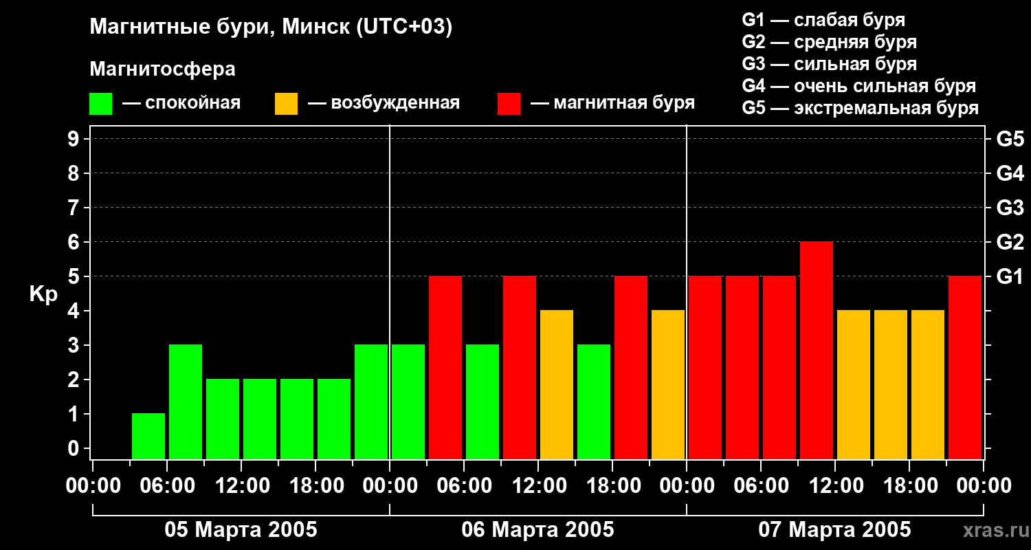 Изменения геомагнитного индекса Kp с 5 по 7 марта 2005 года для средних широт