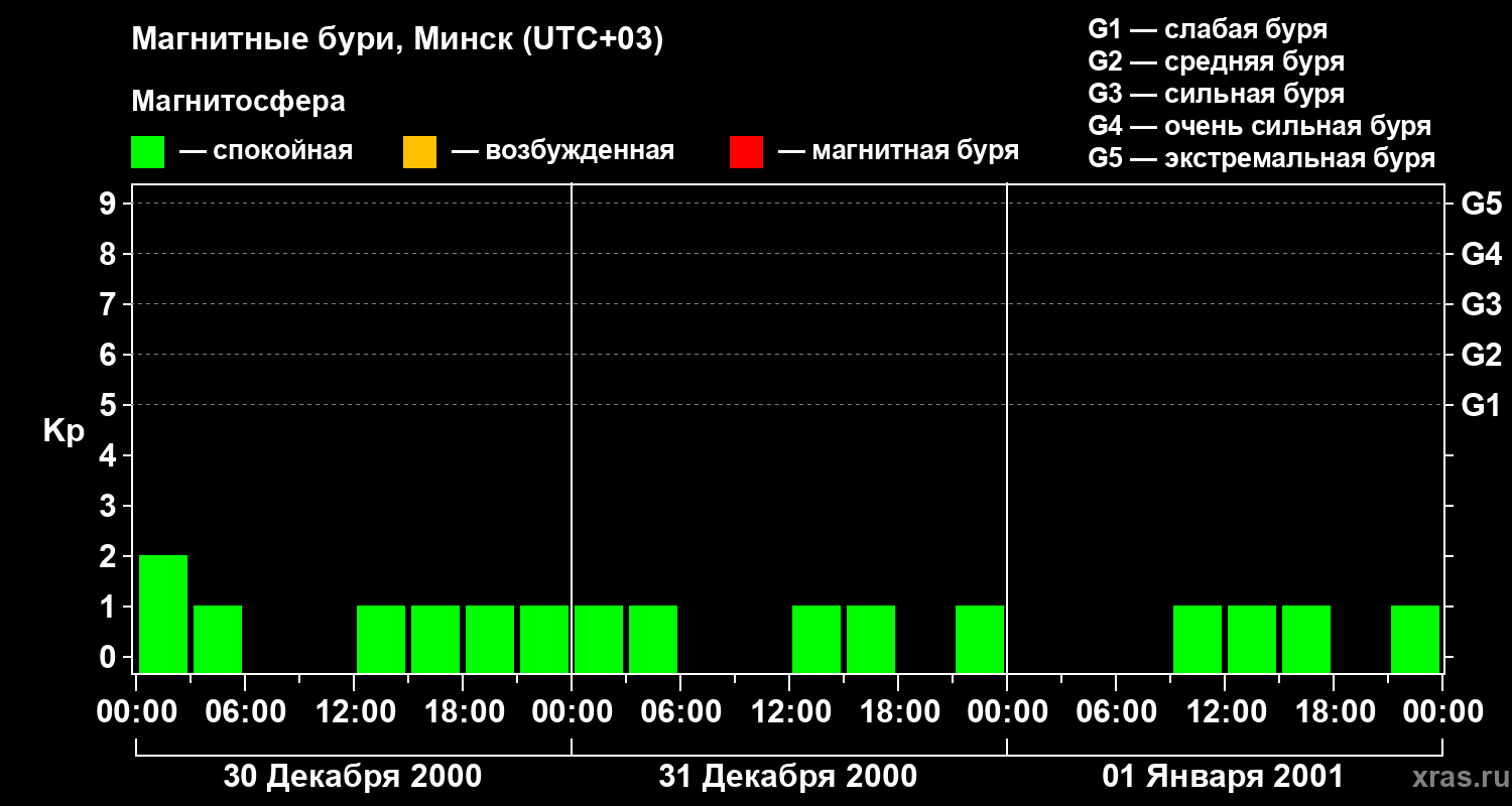 Изменения геомагнитного индекса Kp с 30 декабря 2000 года по 1 января 2001 года для средних широт