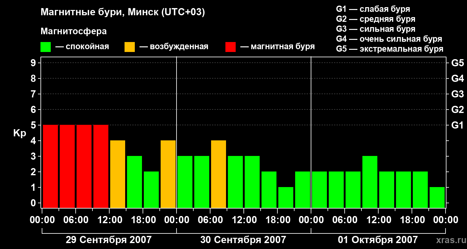 Изменения геомагнитного индекса Kp с 29 сентября по 1 октября 2007 года для средних широт