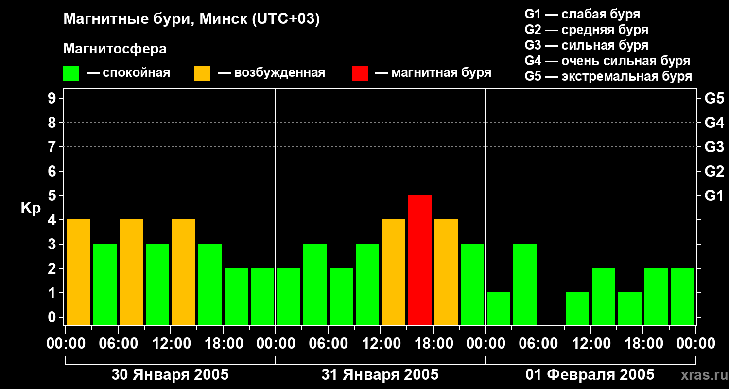 Изменения геомагнитного индекса Kp с 30 января по 1 февраля 2005 года для средних широт