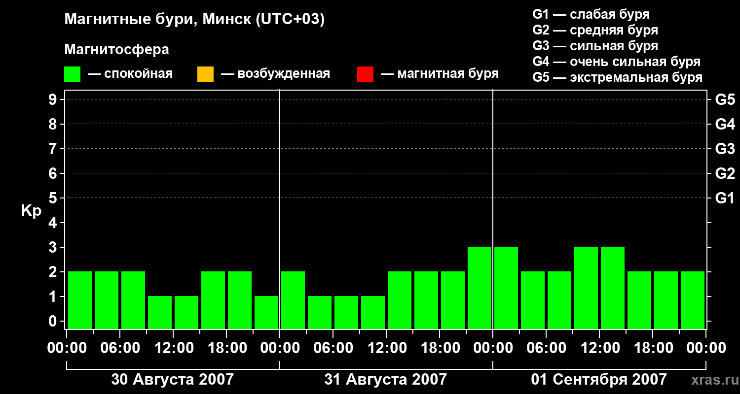 Изменения геомагнитного индекса Kp с 30 августа по 1 сентября 2007 года для средних широт