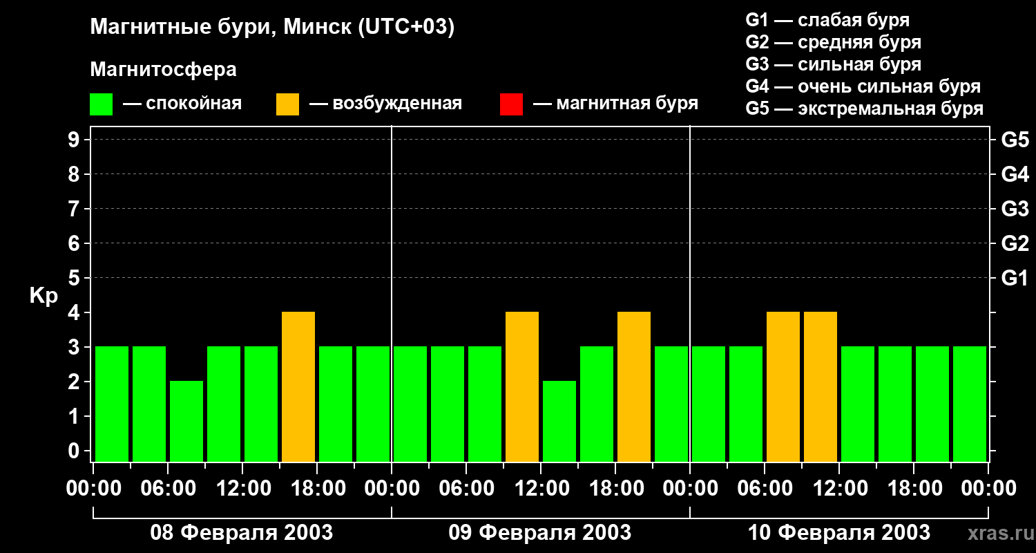 Изменения геомагнитного индекса Kp с 8 по 10 февраля 2003 года для средних широт