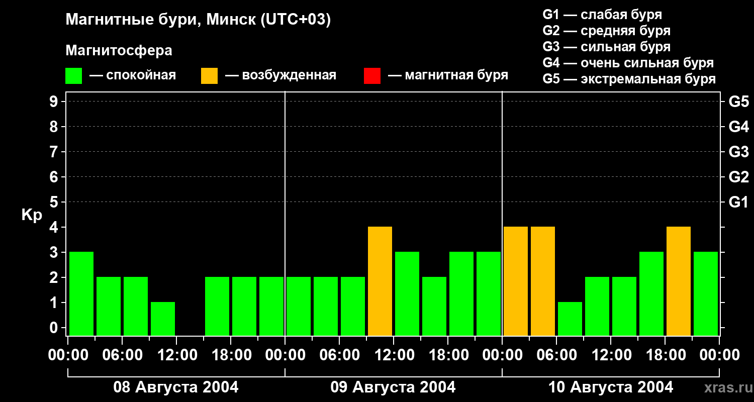 Изменения геомагнитного индекса Kp с 8 по 10 августа 2004 года для средних широт