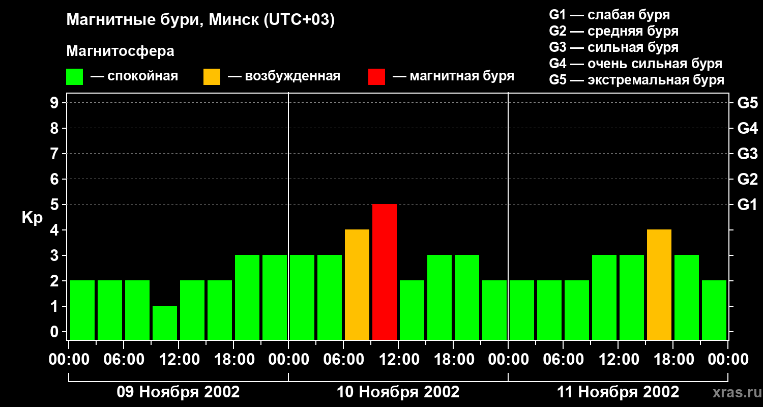 Изменения геомагнитного индекса Kp с 9 по 11 ноября 2002 года для средних широт