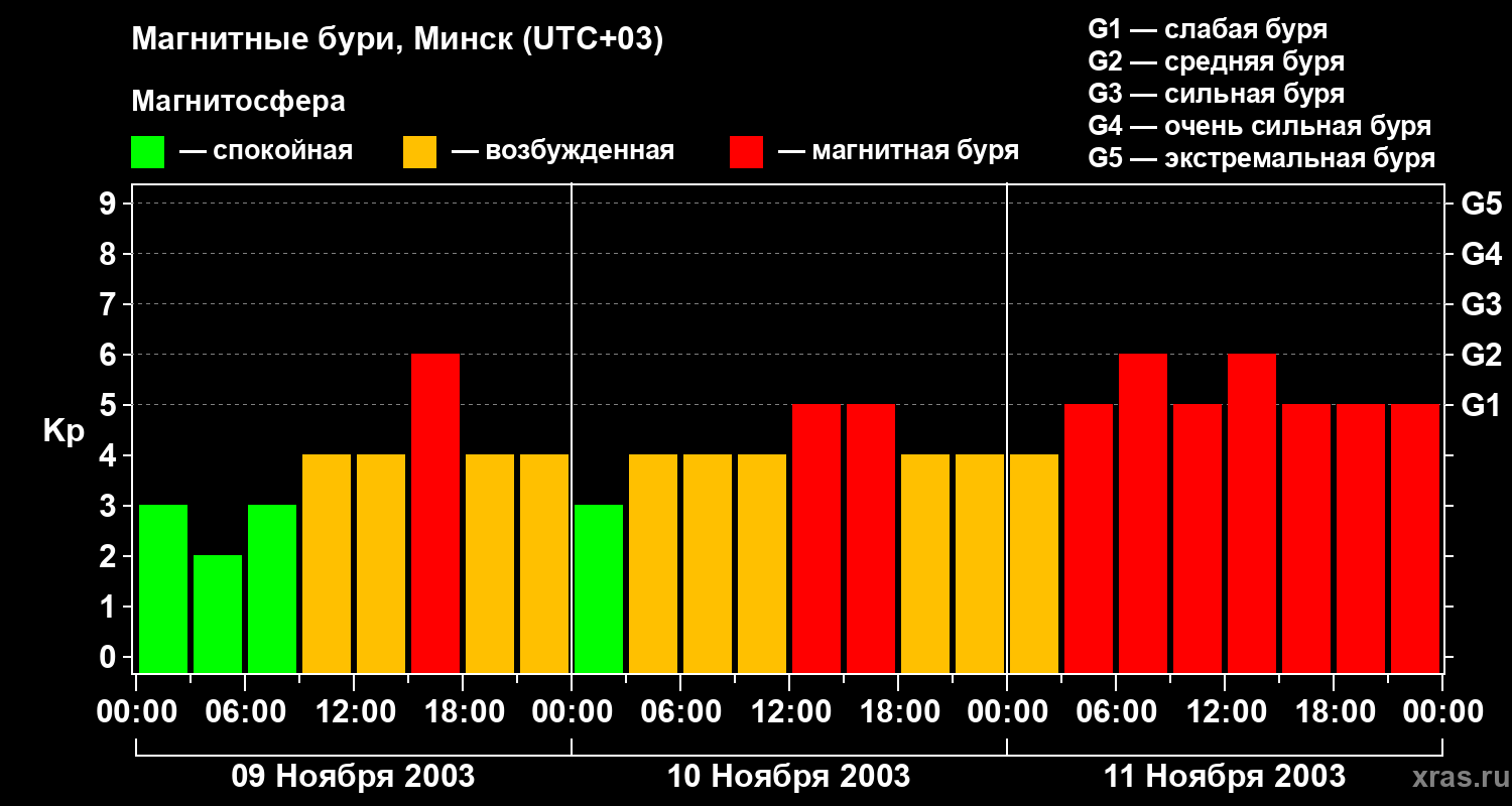Изменения геомагнитного индекса Kp с 9 по 11 ноября 2003 года для средних широт