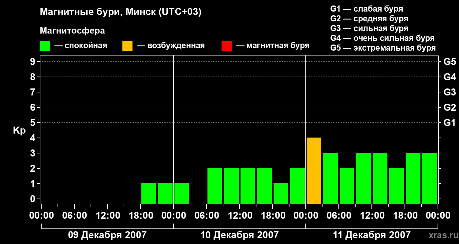 Изменения геомагнитного индекса Kp с 9 по 11 декабря 2007 года для средних широт