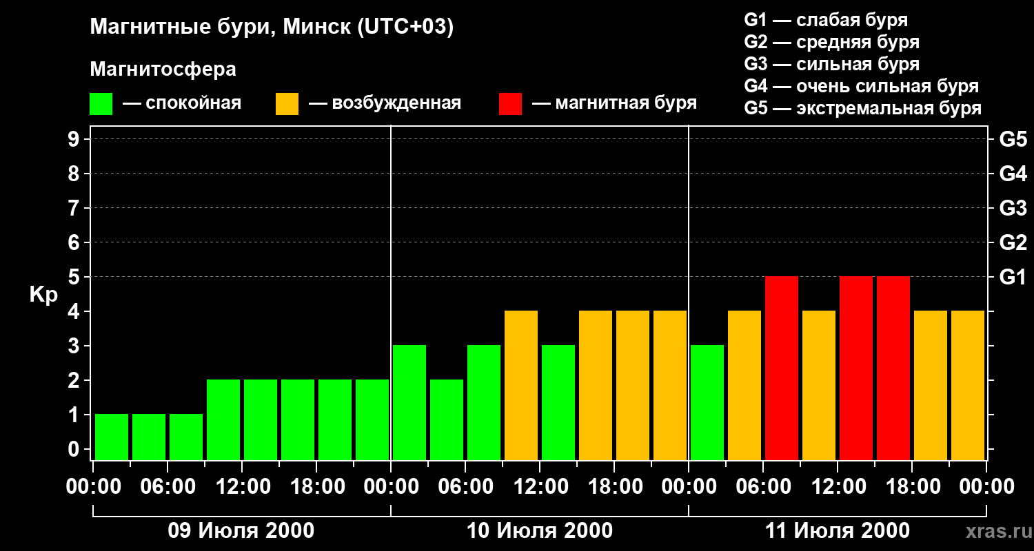 Изменения геомагнитного индекса Kp с 9 по 11 июля 2000 года для средних широт