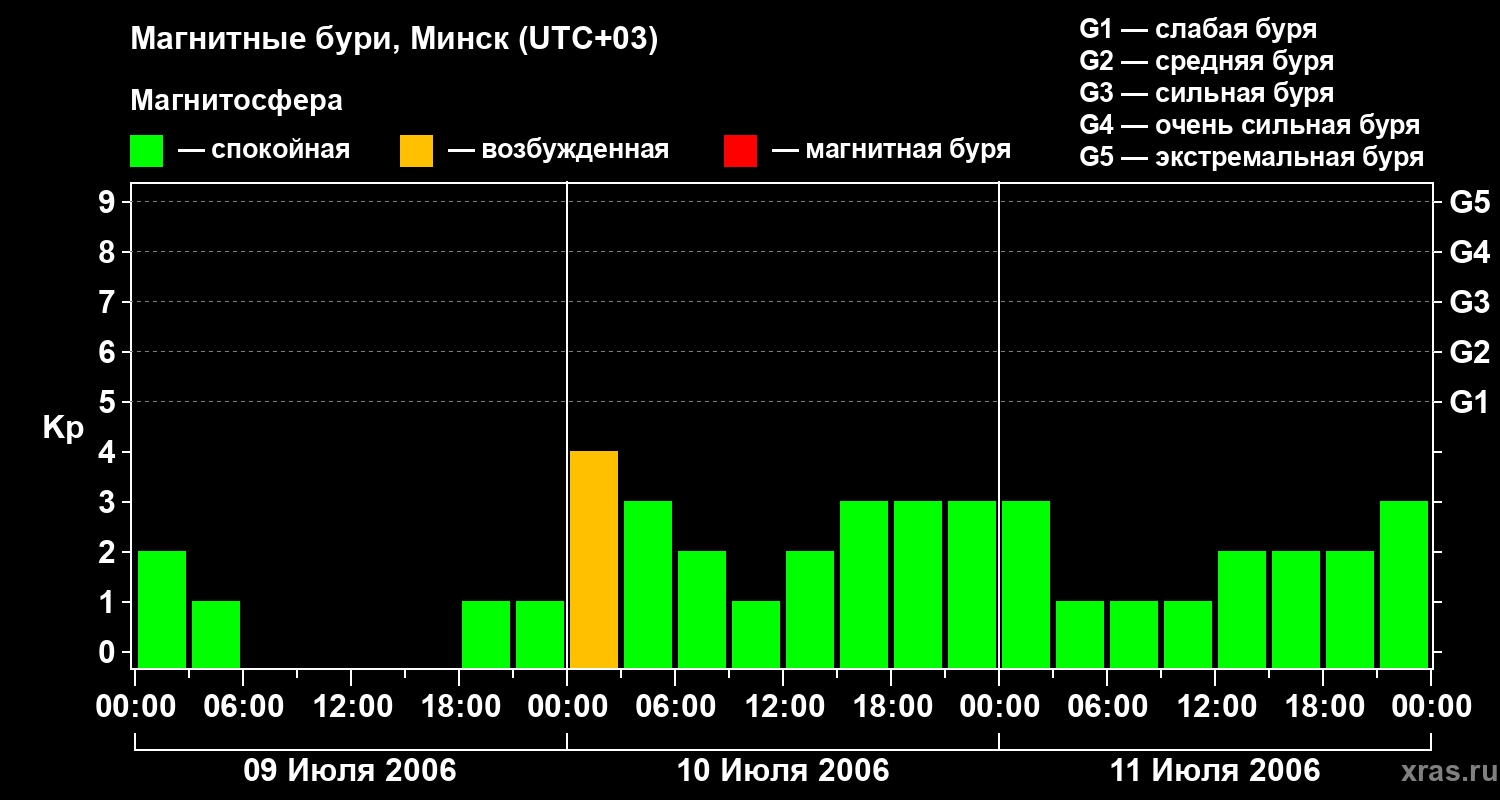 Изменения геомагнитного индекса Kp с 9 по 11 июля 2006 года для средних широт