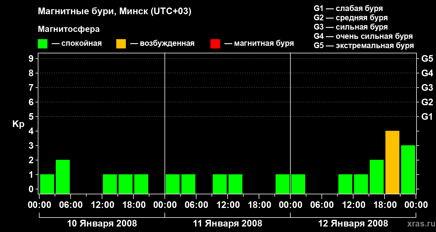 Изменения геомагнитного индекса Kp с 10 по 12 января 2008 года для средних широт