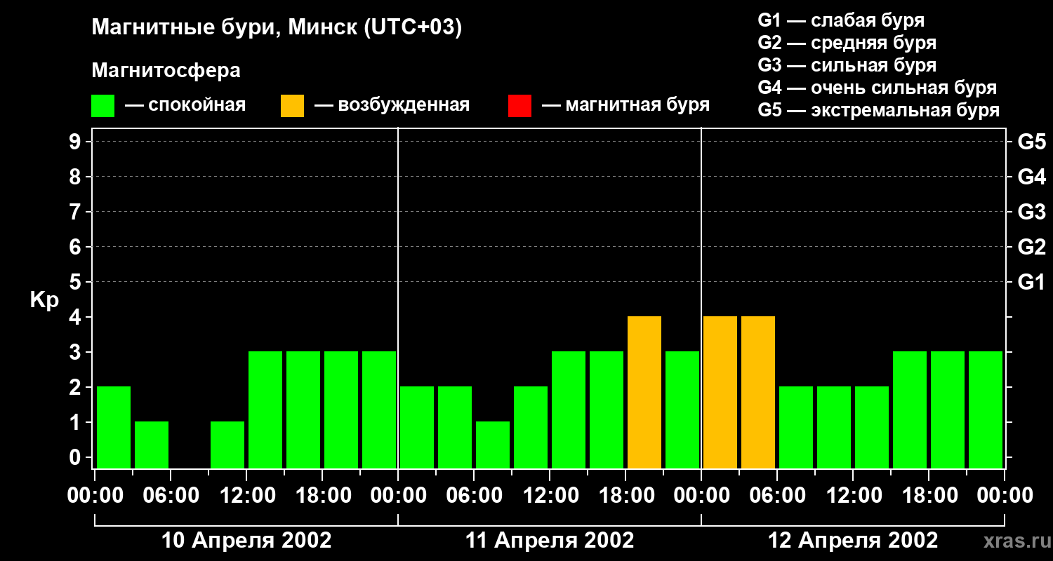 Изменения геомагнитного индекса Kp с 10 по 12 апреля 2002 года для средних широт