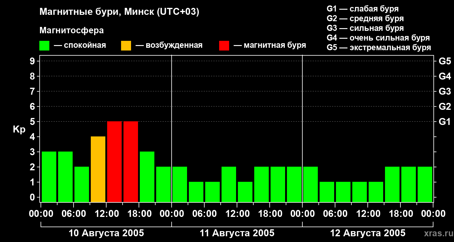 Изменения геомагнитного индекса Kp с 10 по 12 августа 2005 года для средних широт
