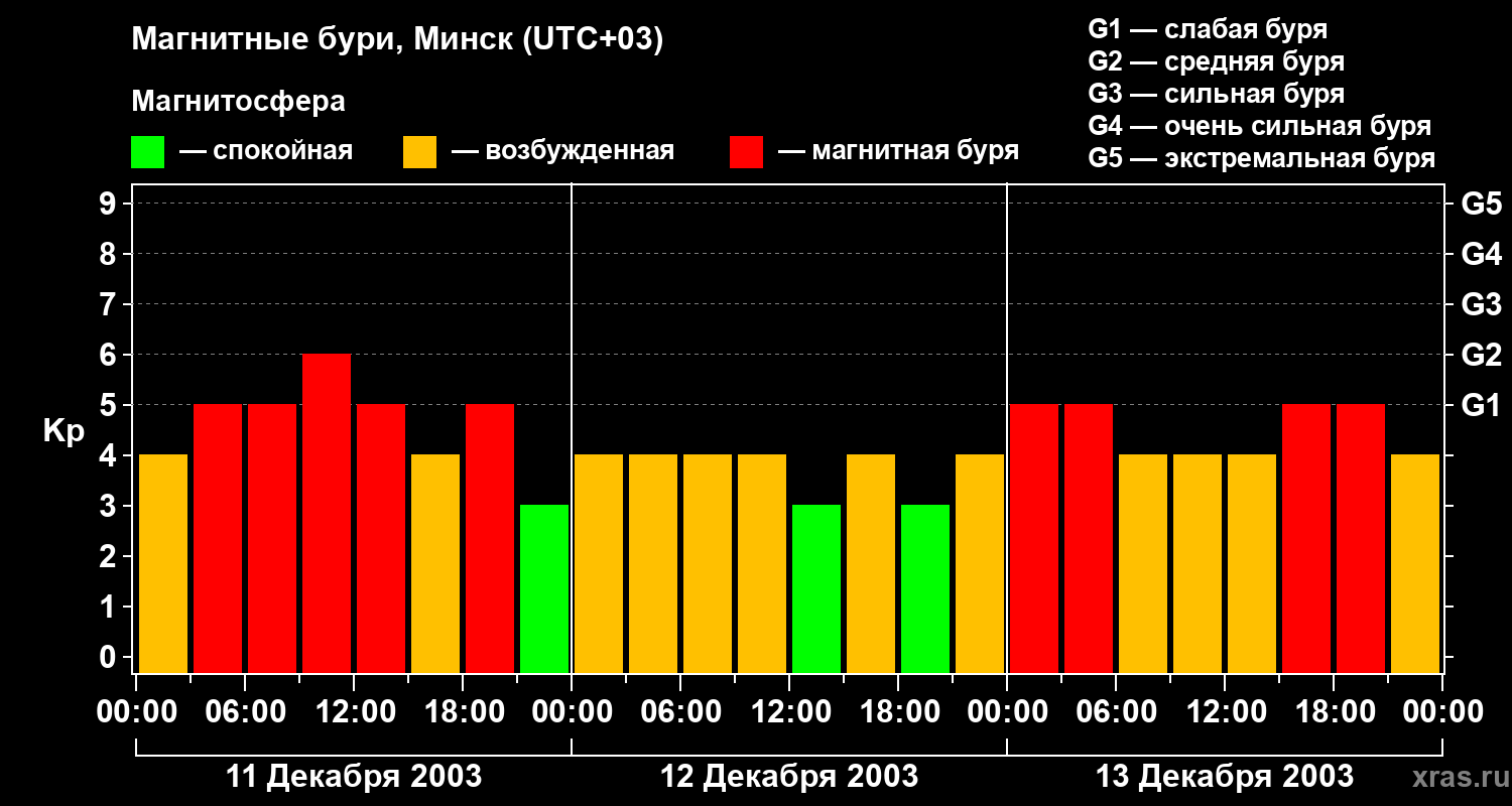 Изменения геомагнитного индекса Kp с 11 по 13 декабря 2003 года для средних широт