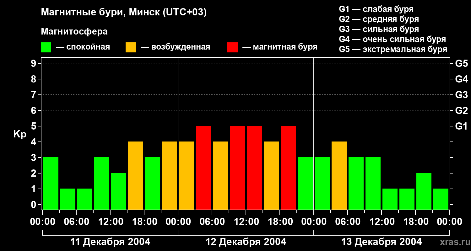 Изменения геомагнитного индекса Kp с 11 по 13 декабря 2004 года для средних широт