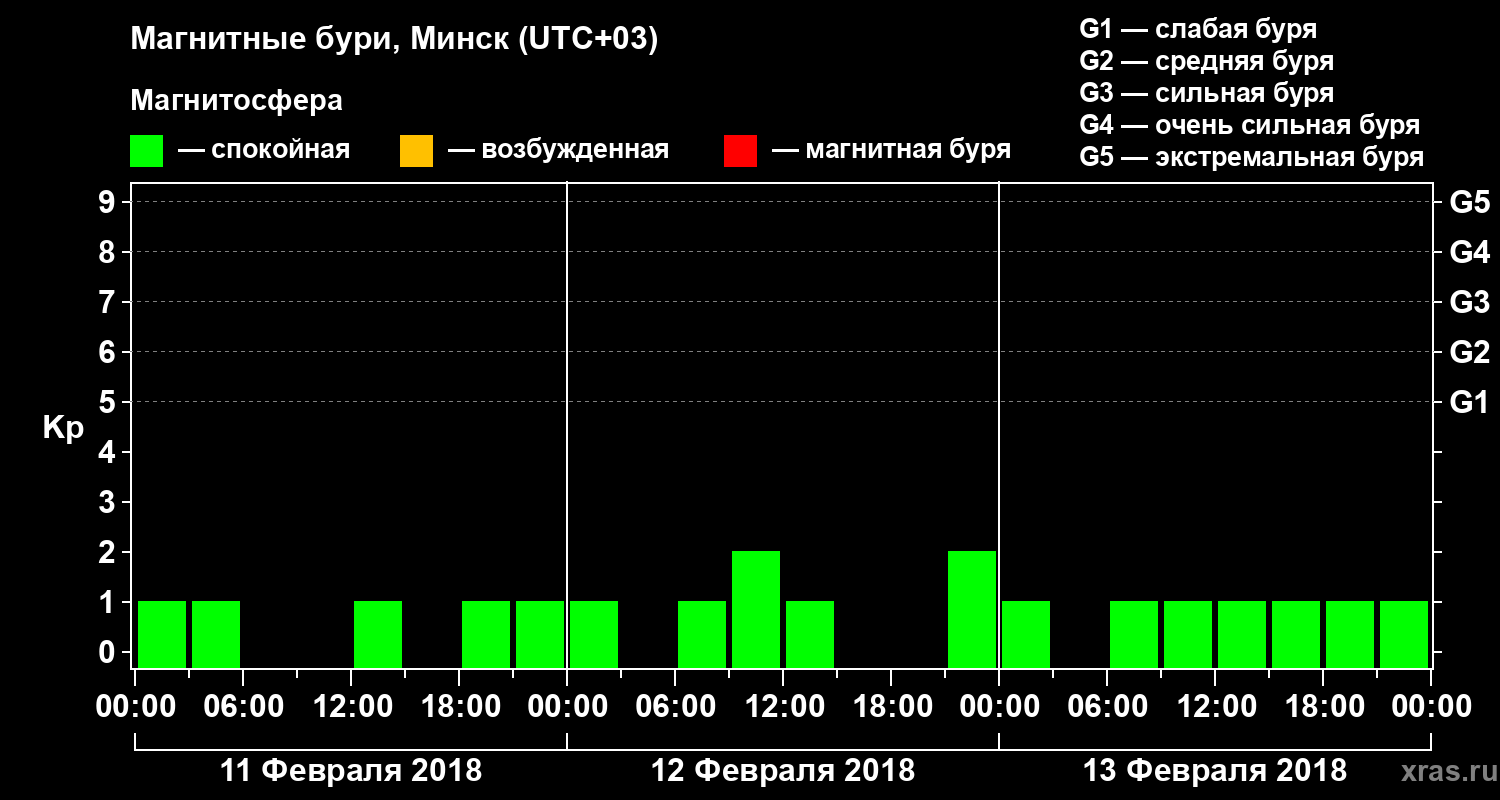 Изменения геомагнитного индекса Kp с 11 по 13 февраля 2018 года для средних широт