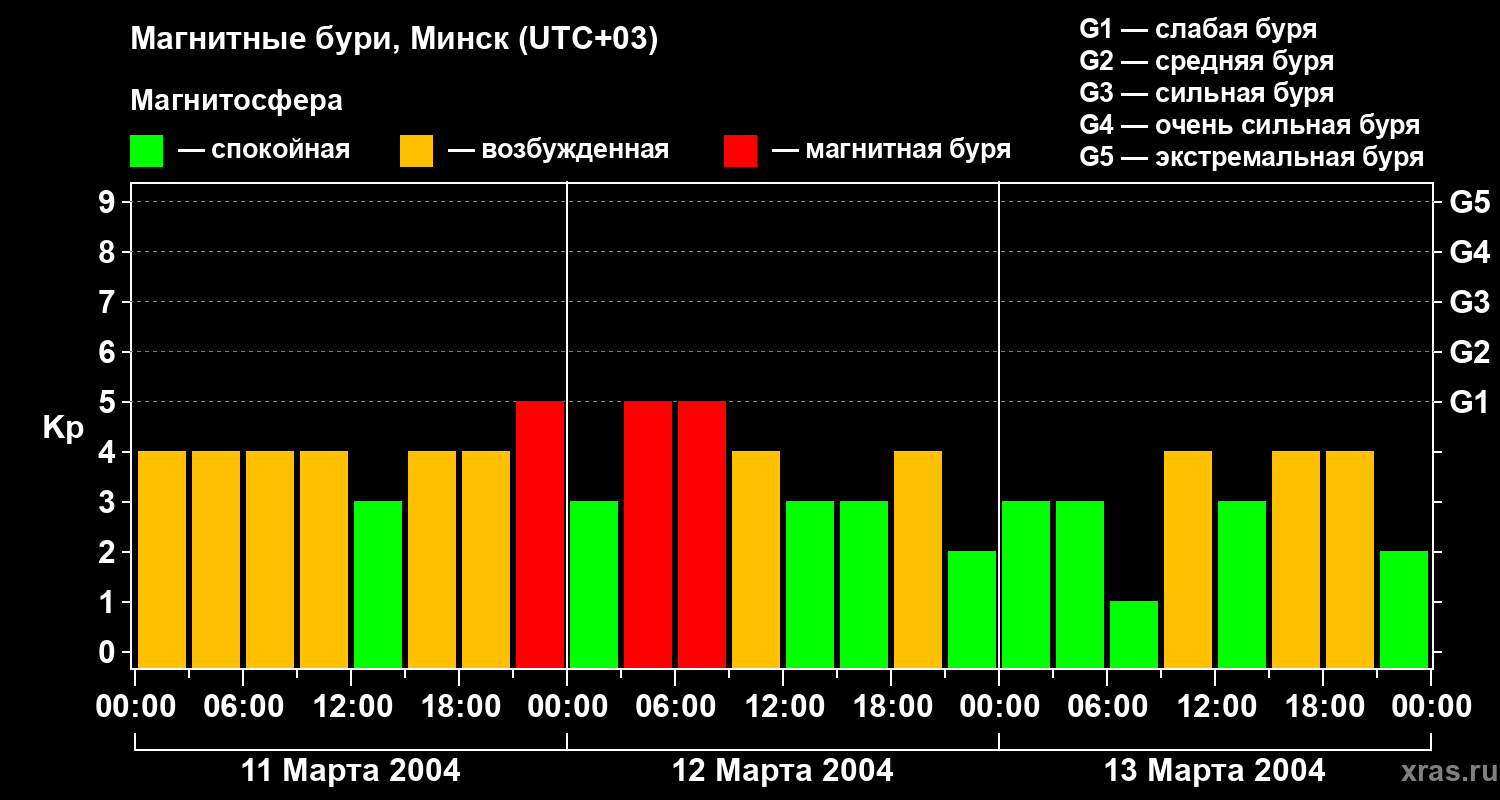 Изменения геомагнитного индекса Kp с 11 по 13 марта 2004 года для средних широт