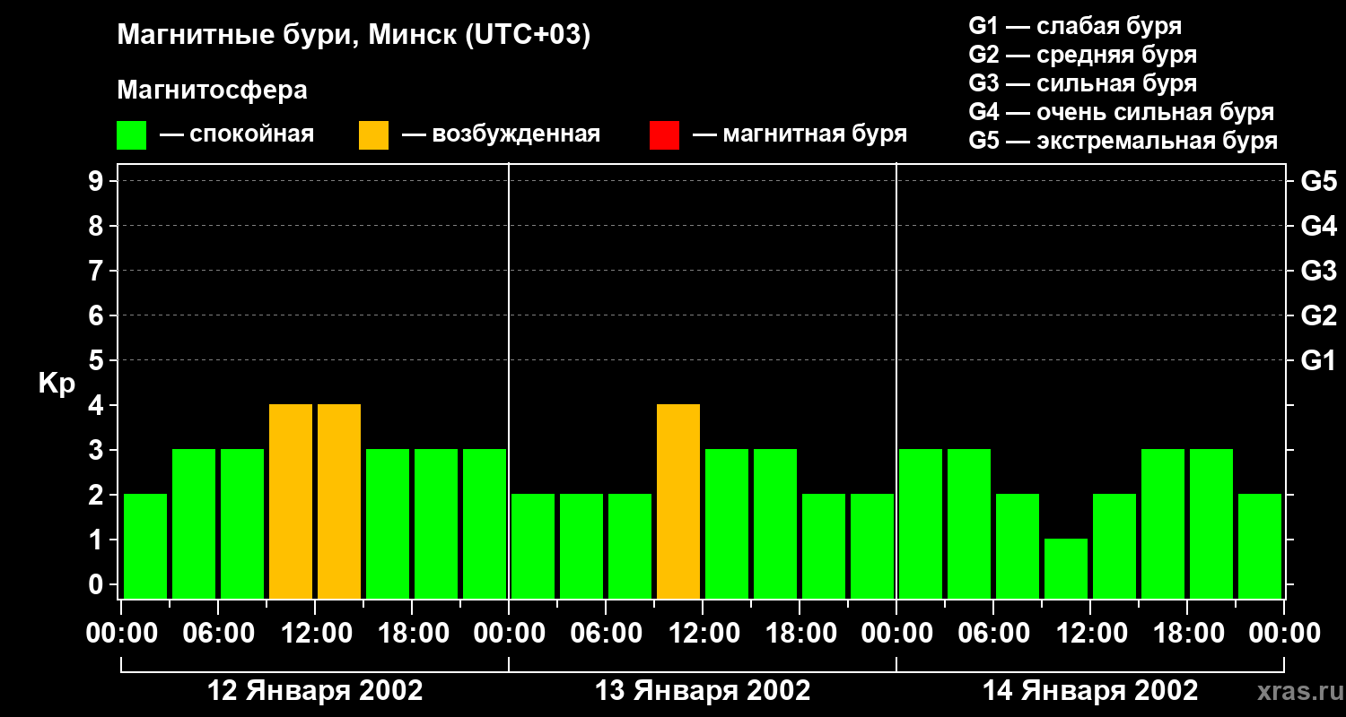 Изменения геомагнитного индекса Kp с 12 по 14 января 2002 года для средних широт