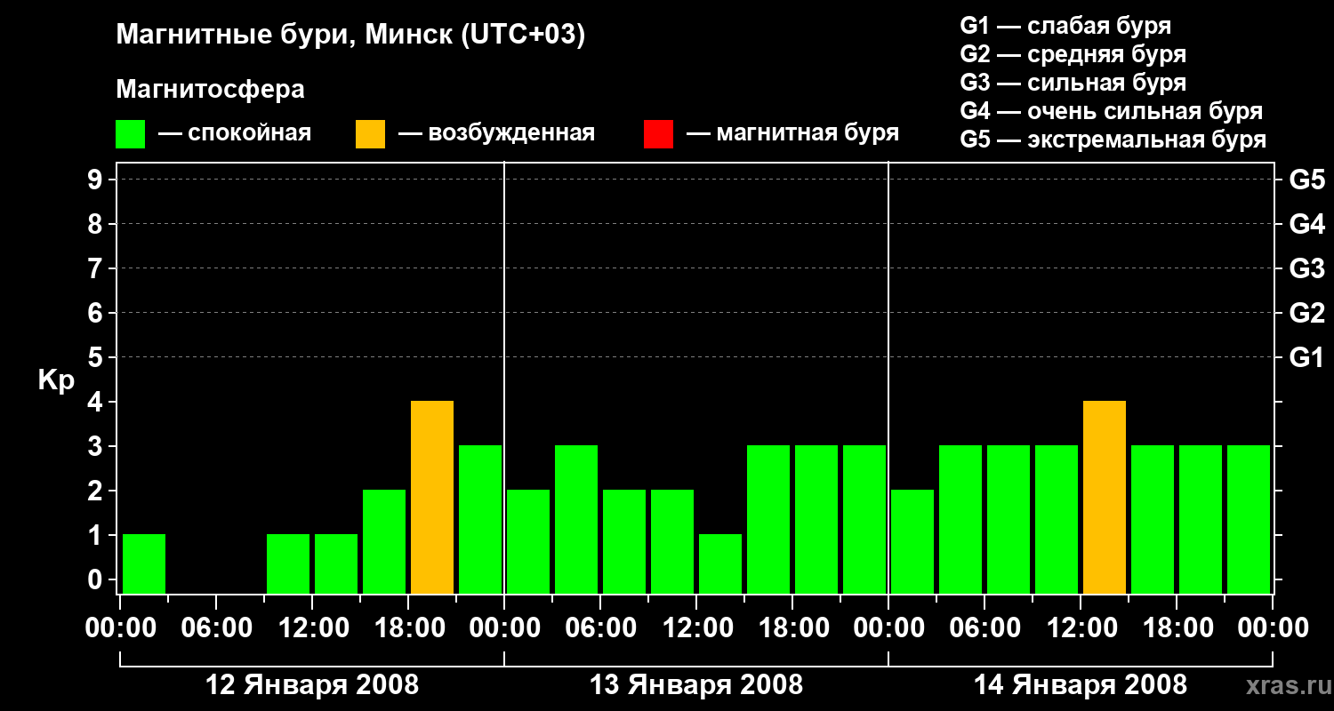 Изменения геомагнитного индекса Kp с 12 по 14 января 2008 года для средних широт