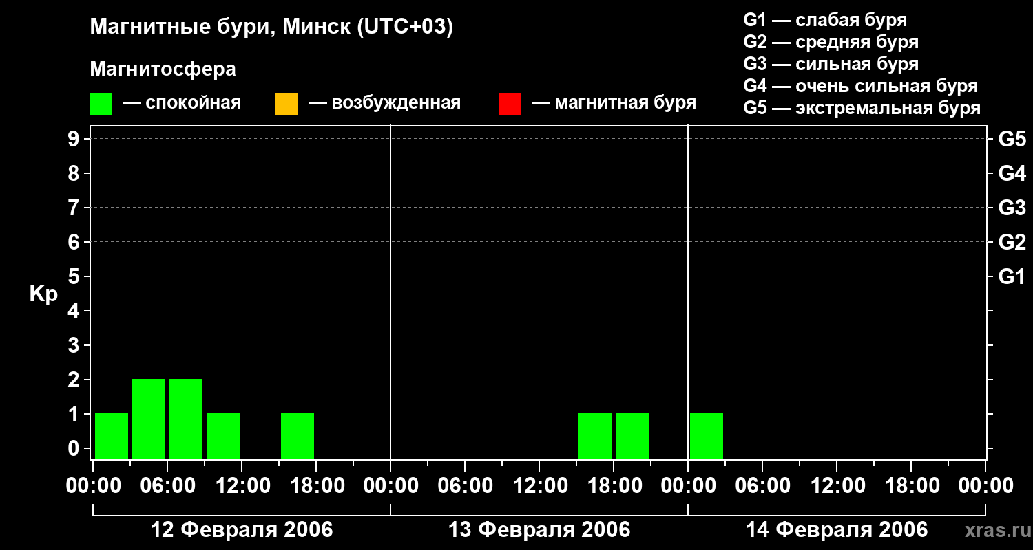 Изменения геомагнитного индекса Kp с 12 по 14 февраля 2006 года для средних широт
