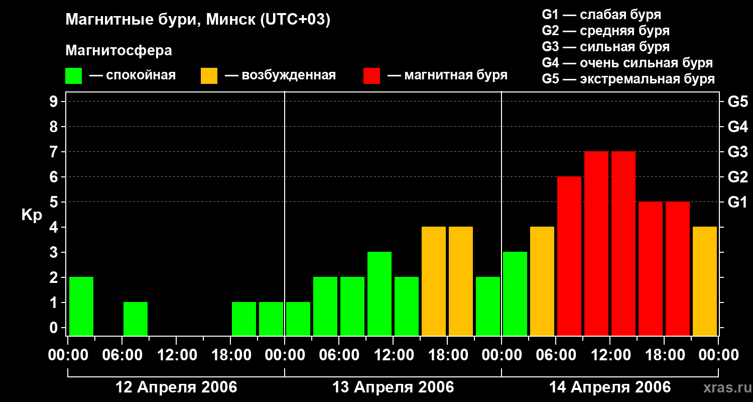 Изменения геомагнитного индекса Kp с 12 по 14 апреля 2006 года для средних широт