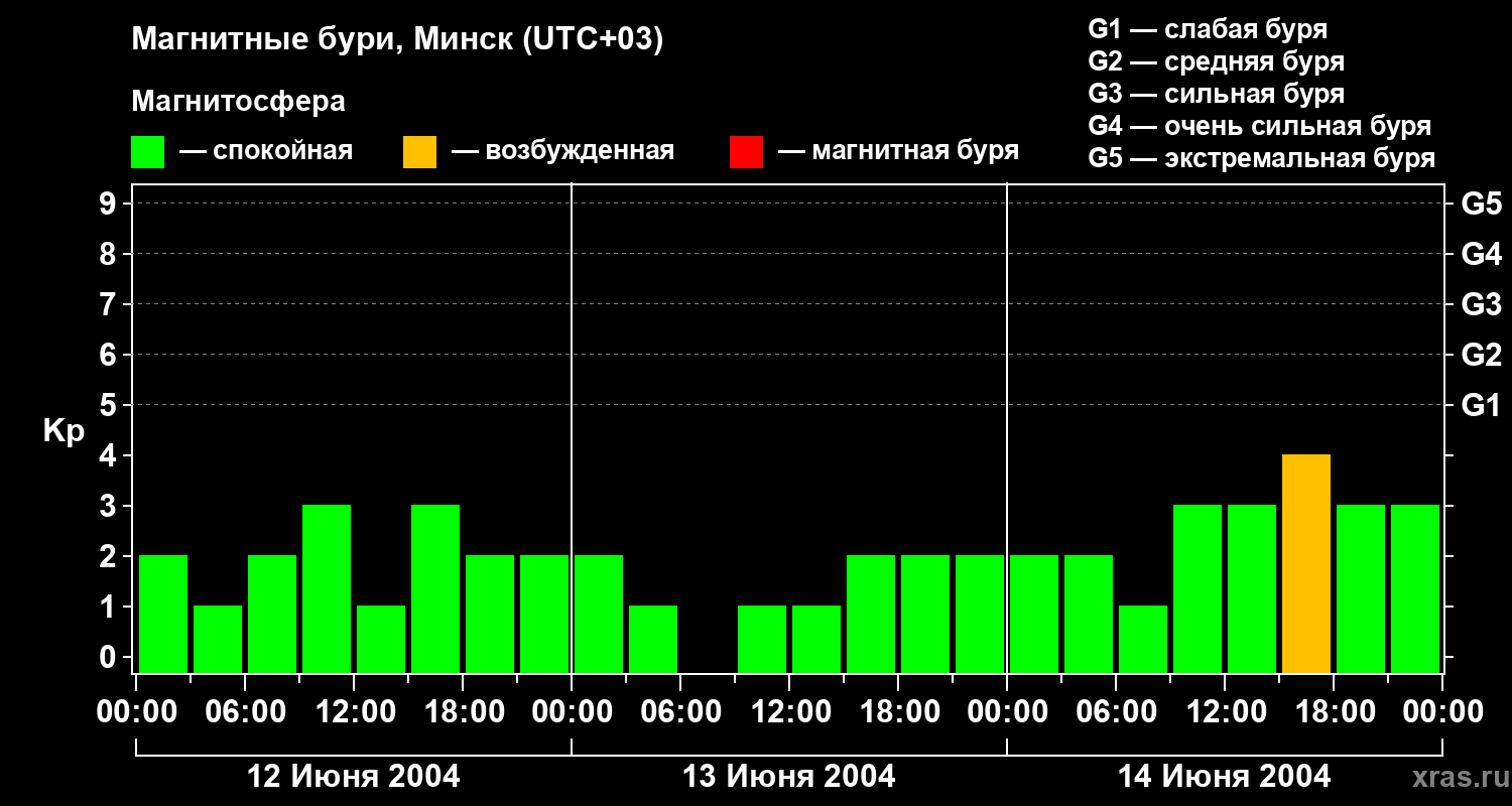Изменения геомагнитного индекса Kp с 12 по 14 июня 2004 года для средних широт