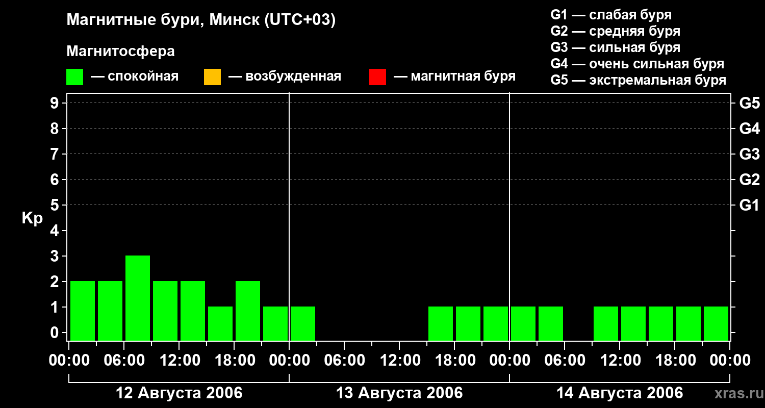 Изменения геомагнитного индекса Kp с 12 по 14 августа 2006 года для средних широт