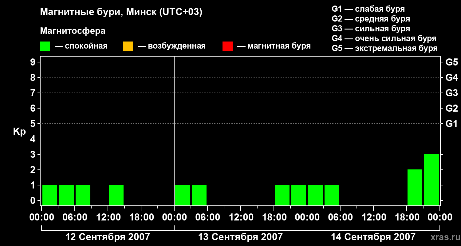 Изменения геомагнитного индекса Kp с 12 по 14 сентября 2007 года для средних широт