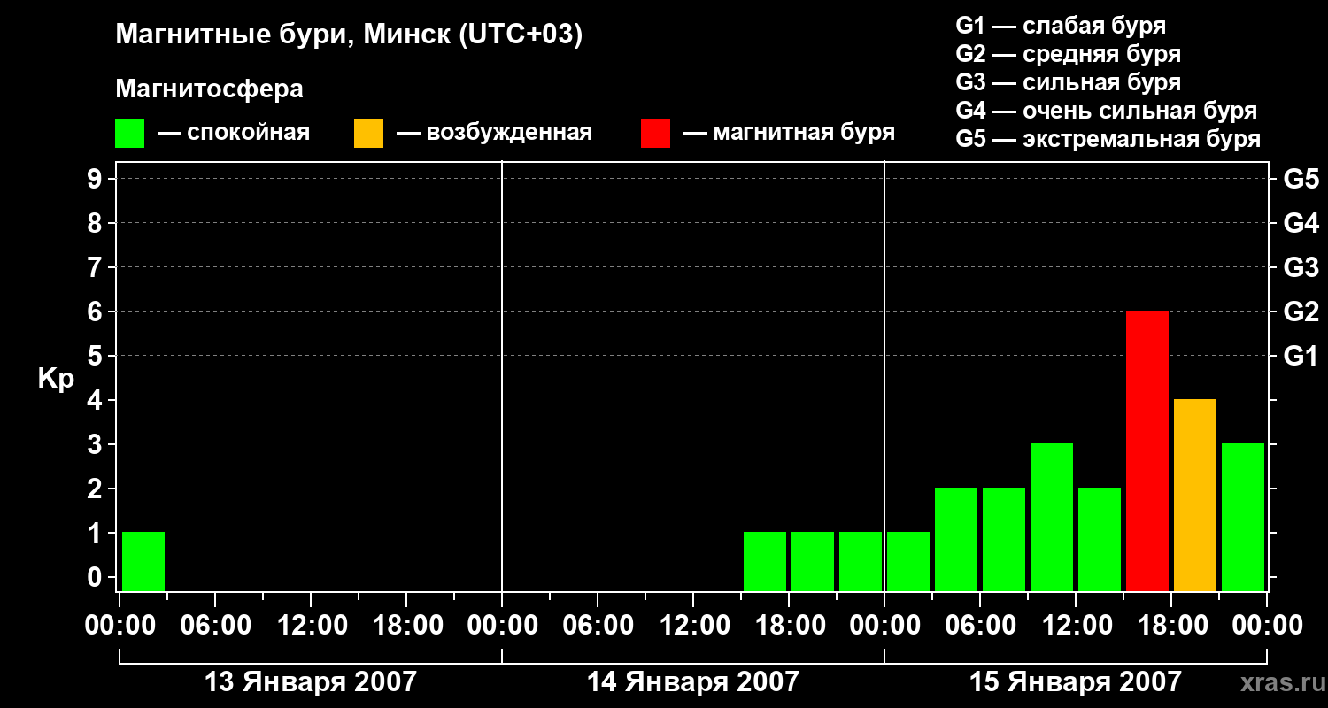 Изменения геомагнитного индекса Kp с 13 по 15 января 2007 года для средних широт