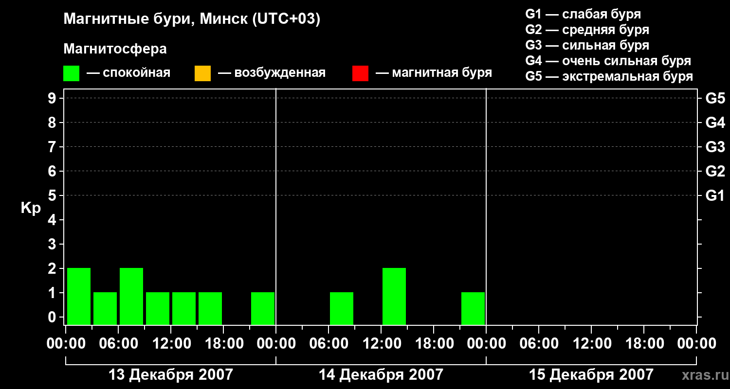 Изменения геомагнитного индекса Kp с 13 по 15 декабря 2007 года для средних широт
