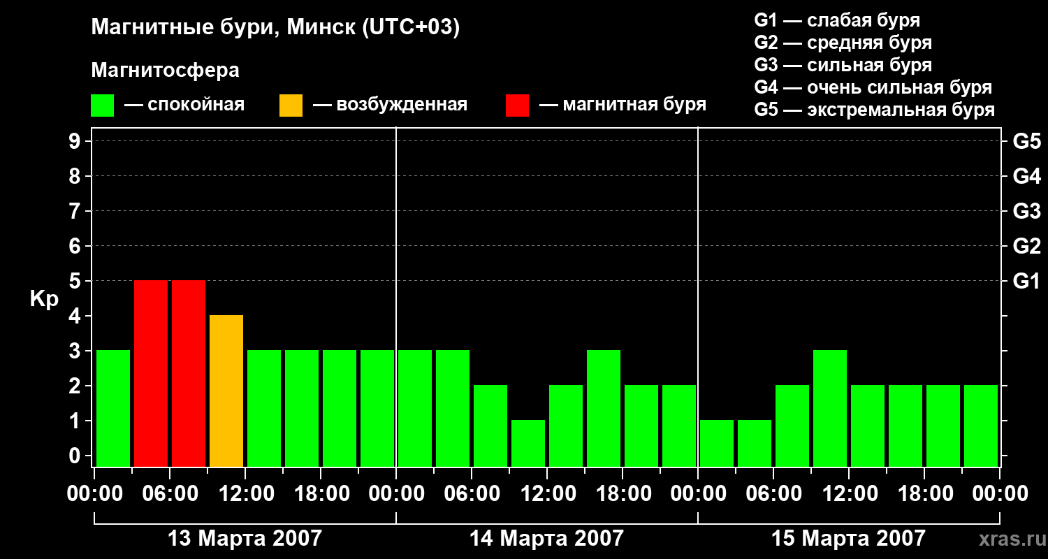 Изменения геомагнитного индекса Kp с 13 по 15 марта 2007 года для средних широт