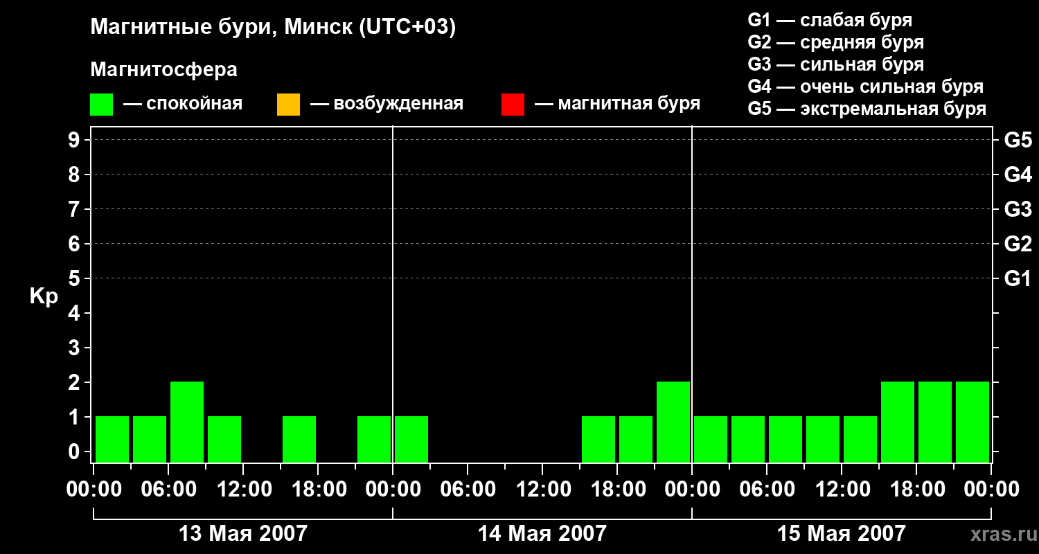 Изменения геомагнитного индекса Kp с 13 по 15 мая 2007 года для средних широт