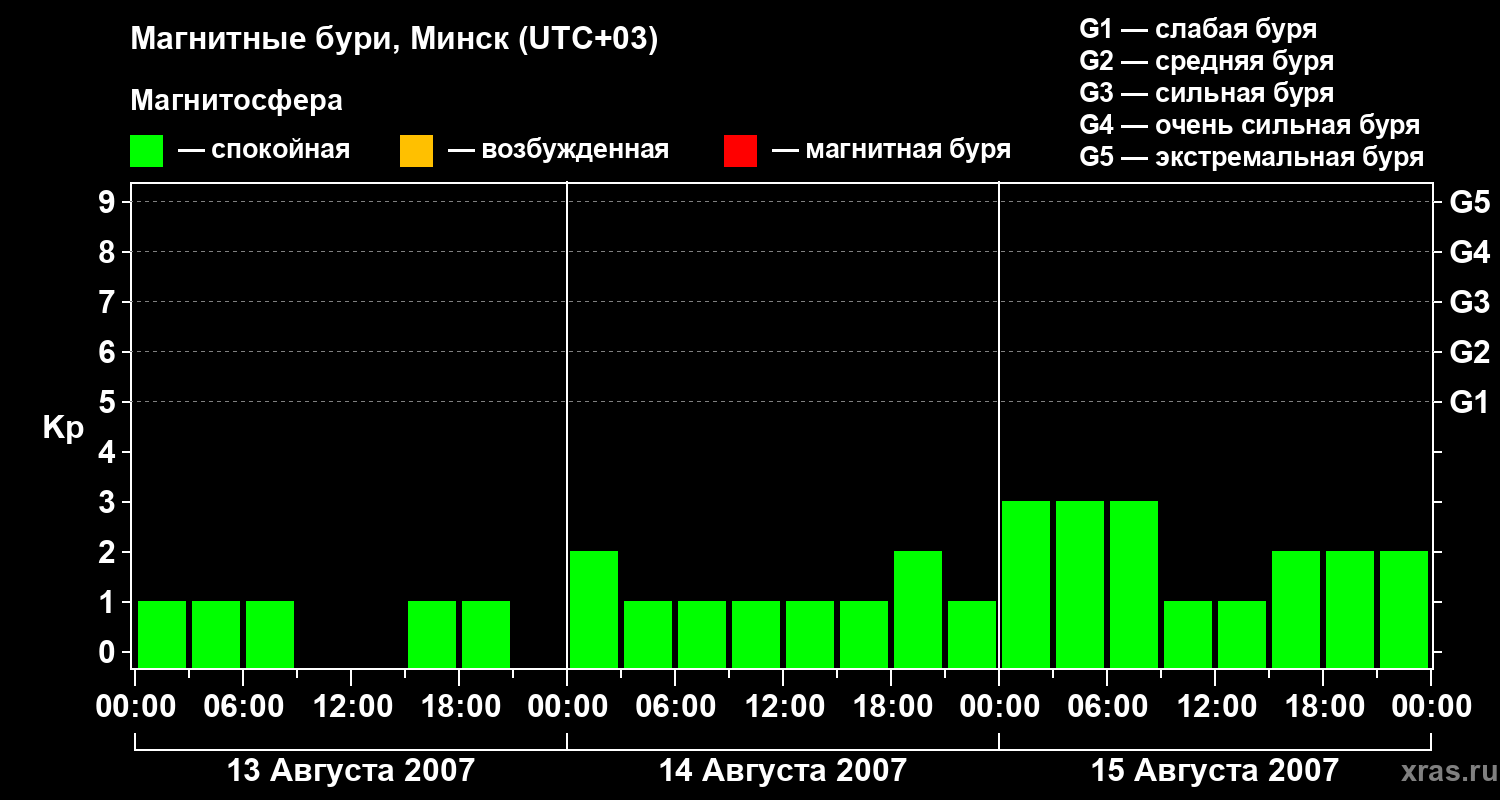 Изменения геомагнитного индекса Kp с 13 по 15 августа 2007 года для средних широт