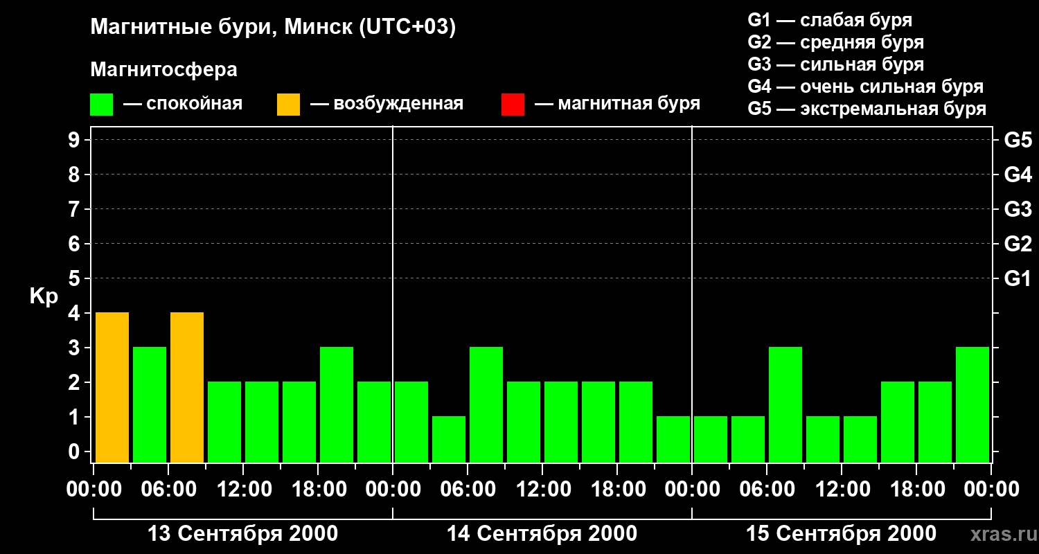 Изменения геомагнитного индекса Kp с 13 по 15 сентября 2000 года для средних широт