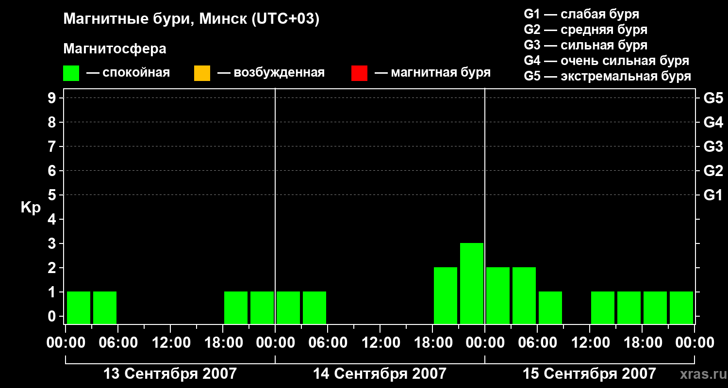 Изменения геомагнитного индекса Kp с 13 по 15 сентября 2007 года для средних широт