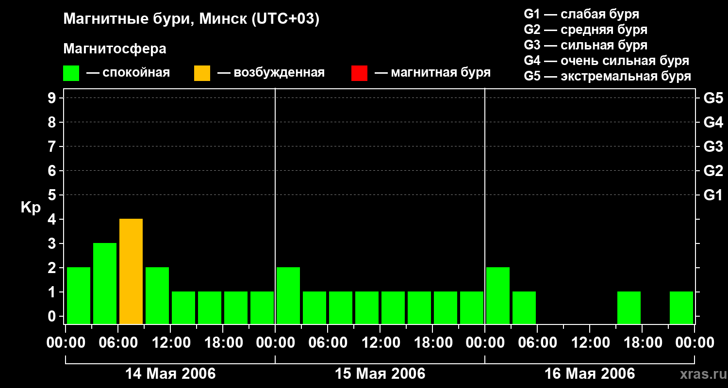 Изменения геомагнитного индекса Kp с 14 по 16 мая 2006 года для средних широт