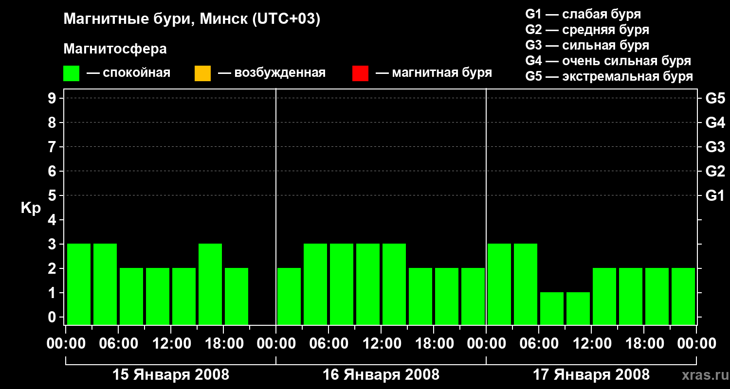Изменения геомагнитного индекса Kp с 15 по 17 января 2008 года для средних широт