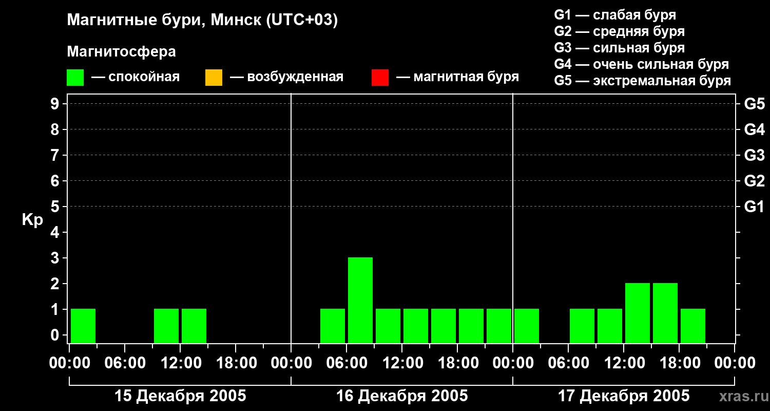 Изменения геомагнитного индекса Kp с 15 по 17 декабря 2005 года для средних широт