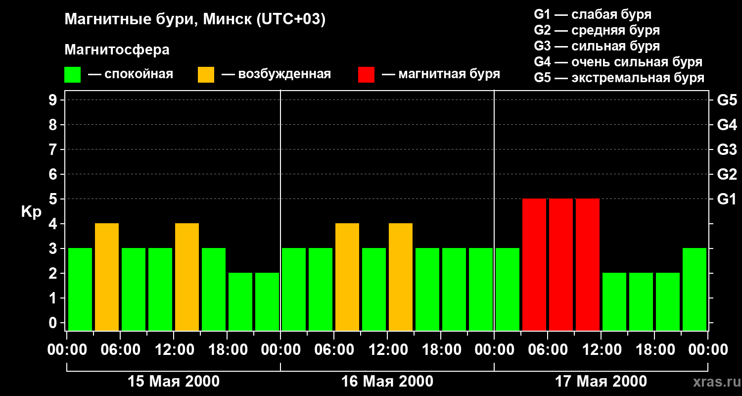 Изменения геомагнитного индекса Kp с 15 по 17 мая 2000 года для средних широт