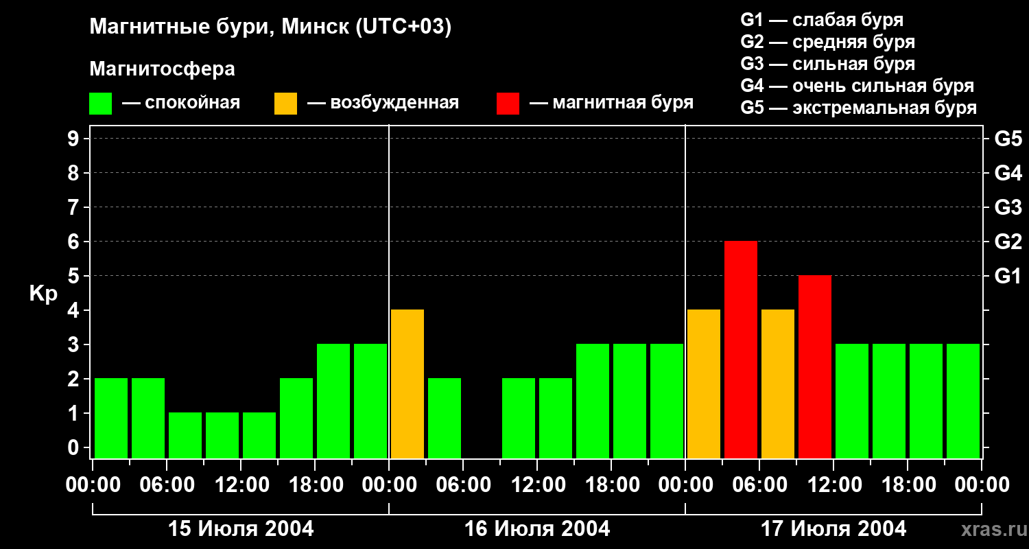 Изменения геомагнитного индекса Kp с 15 по 17 июля 2004 года для средних широт
