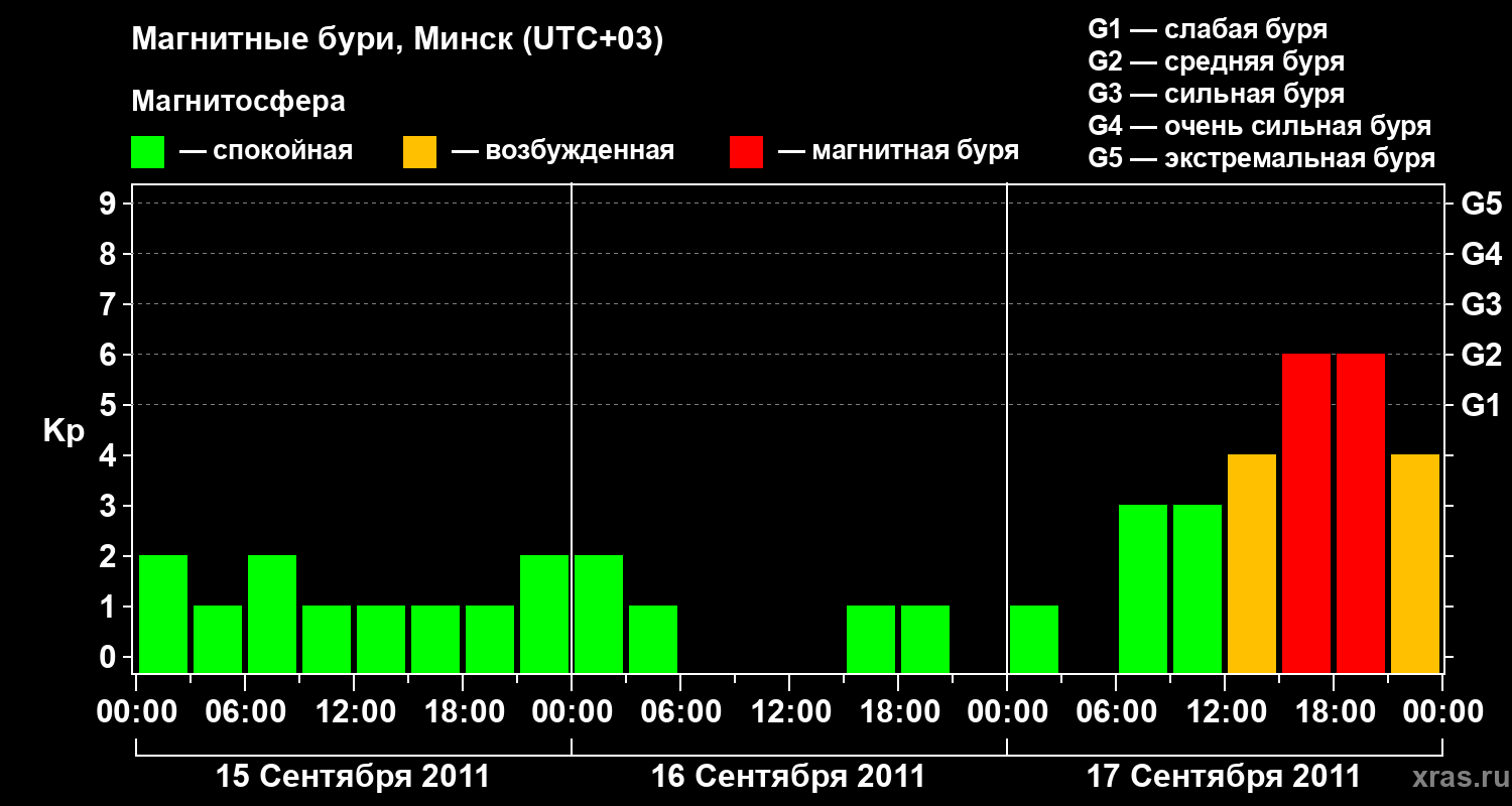 Изменения геомагнитного индекса Kp с 15 по 17 сентября 2011 года для средних широт