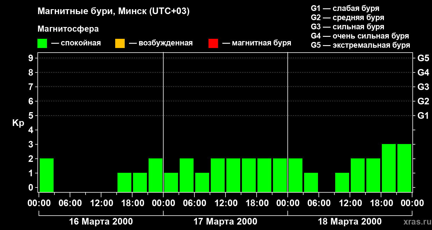 Изменения геомагнитного индекса Kp с 16 по 18 марта 2000 года для средних широт