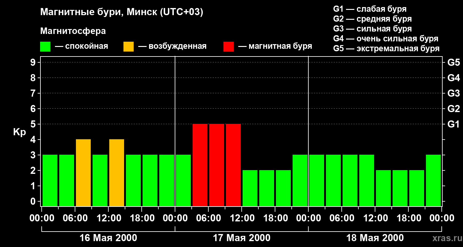Изменения геомагнитного индекса Kp с 16 по 18 мая 2000 года для средних широт