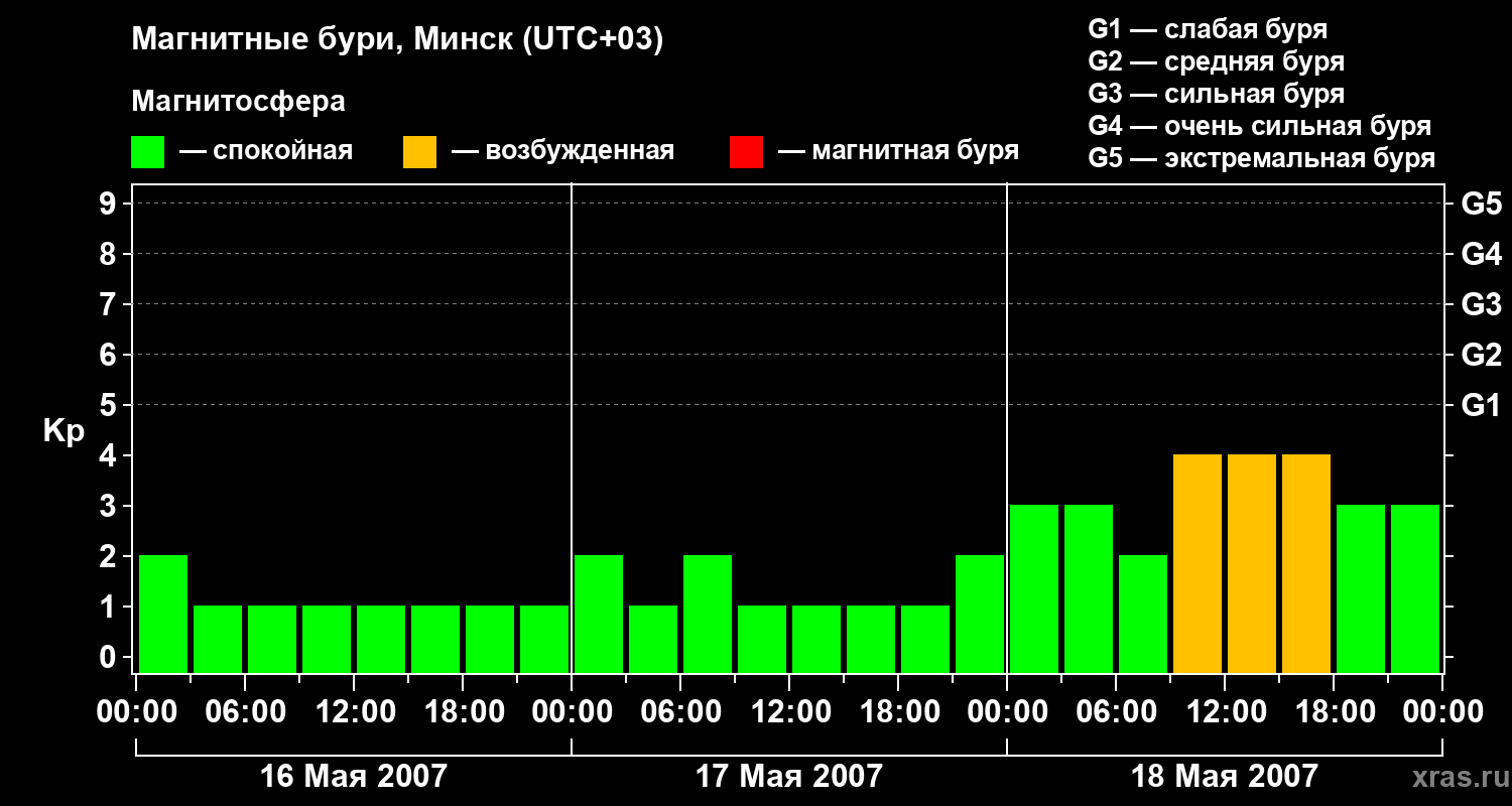 Изменения геомагнитного индекса Kp с 16 по 18 мая 2007 года для средних широт