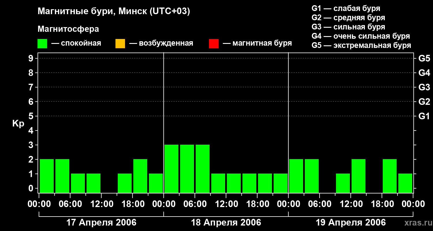 Изменения геомагнитного индекса Kp с 17 по 19 апреля 2006 года для средних широт